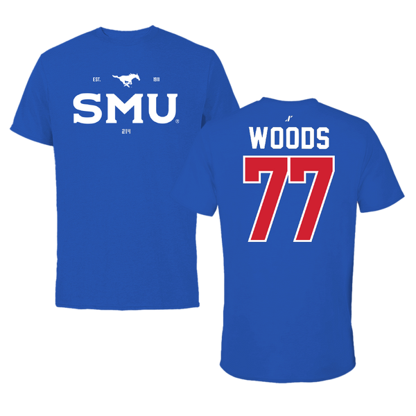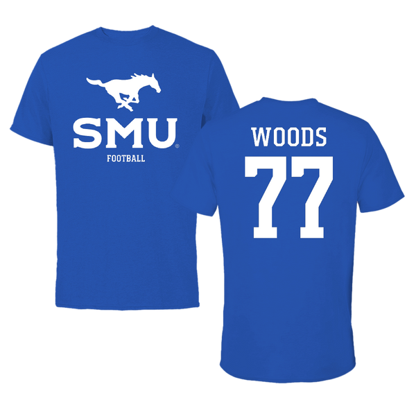 Southern Methodist University Football Blue Mascot Tee - #77 Alex Woods