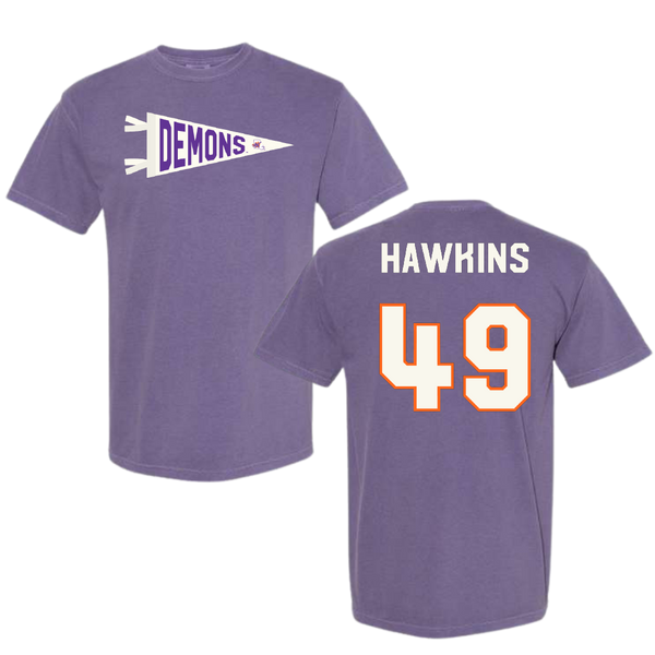 Northwestern State University Football Purple Pennant Comfort Colors Tee - #49 Christian Hawkins