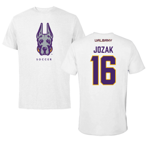 University at Albany Soccer White Mascot Tee - #16 Emily Jozak