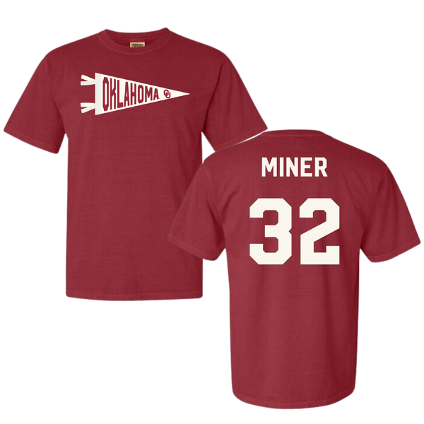 University of Oklahoma Baseball Crimson Pennant Comfort Colors Tee - #32 Jace Miner