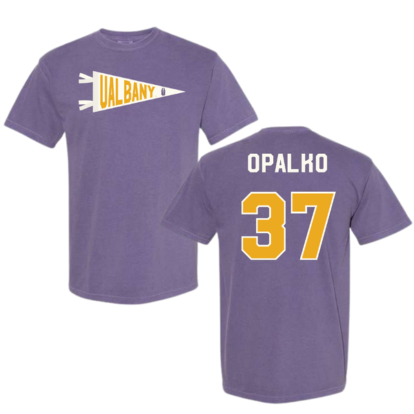 University at Albany Football Purple Pennant Comfort Colors Tee - #37 John Opalko