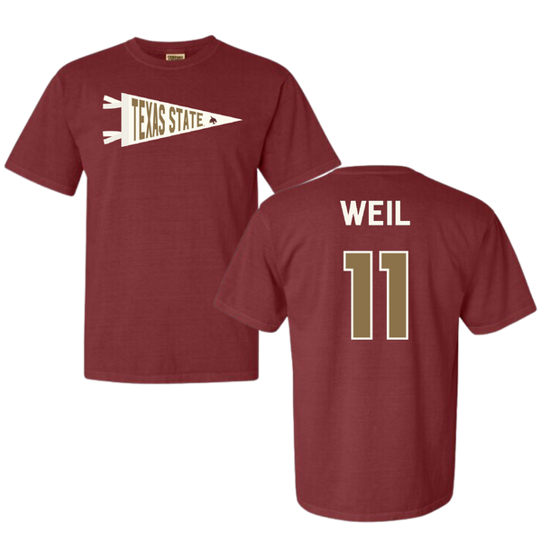 Texas State University Baseball Maroon Pennant Comfort Colors Tee - #11 Kameron Weil