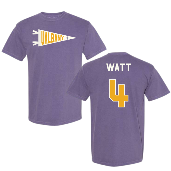 University at Albany Soccer Purple Pennant Comfort Colors Tee - #4 Lucas Watt