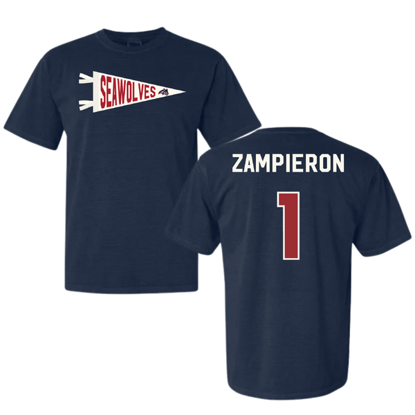 Stony Brook University Baseball Navy Pennant Comfort Colors Tee - #1 Nick Zampieron