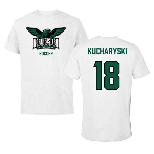 Northeastern State University Soccer White Tee - #18 Olivia Kucharyski