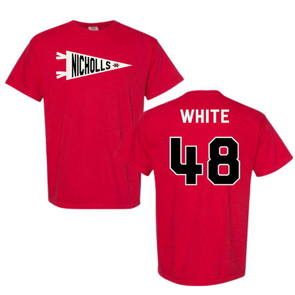 Nicholls State University Football Red Pennant Comfort Colors Tee - #48 Scott White