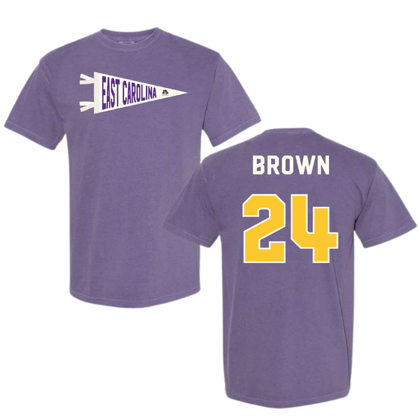 East Carolina University Football Purple Pennant Comfort Colors Tee - #24 TyMir Brown