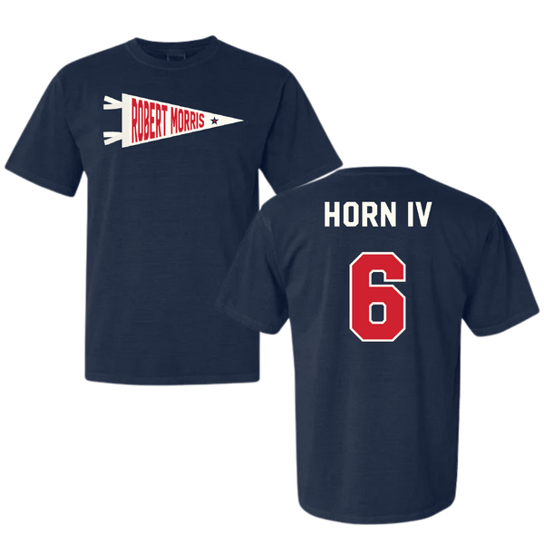 Robert Morris University Football Navy Pennant Comfort Colors Tee - #6 Will Horn IV