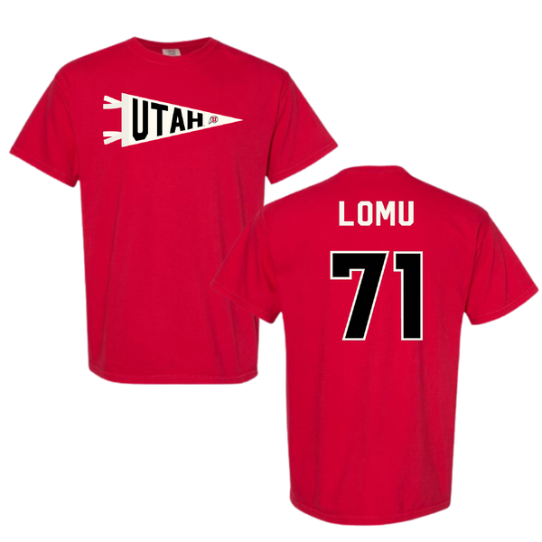 University of Utah Football Red Pennant Comfort Colors Tee - #71 Caleb Lomu