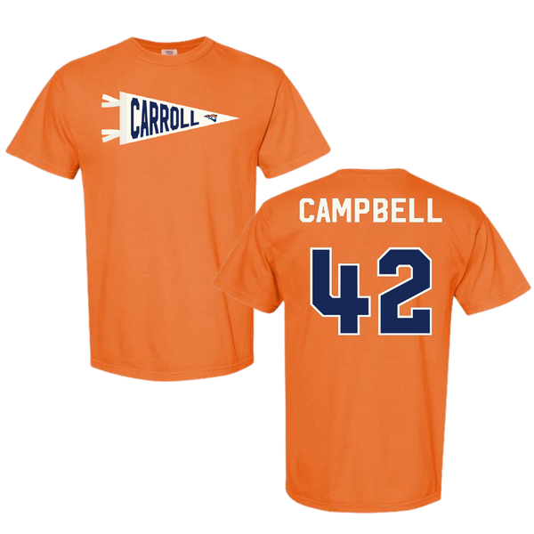 Carroll University Football Orange Pennant Comfort Colors Tee - #42 Will Campbell
