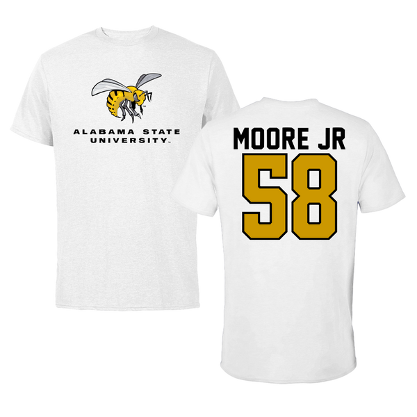 Alabama State University Football White Performance Tee - #58 Michael Moore Jr