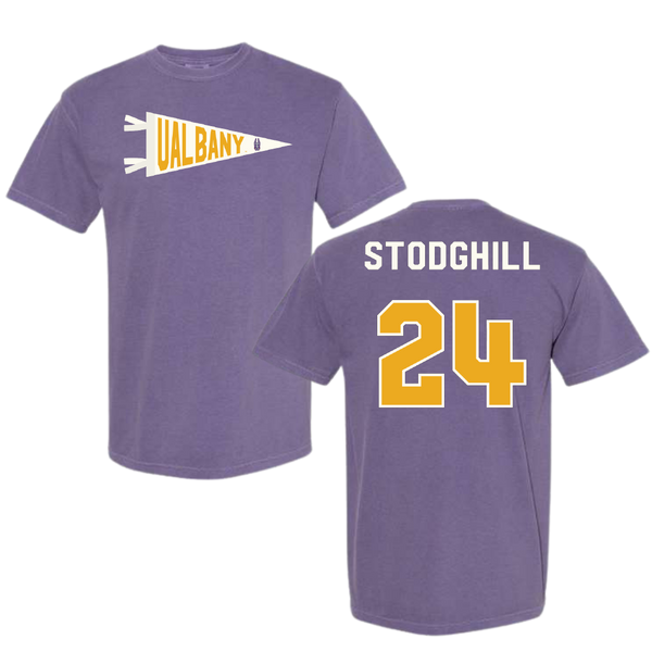 University at Albany Football Purple Pennant Comfort Colors Tee - #24 Cam Stodghill