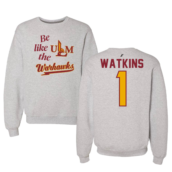 University of Louisiana Monroe Basketball Light Gray Be Like Us Crewneck - #1 Chardai Watkins