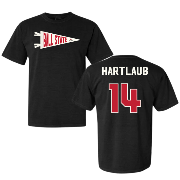 Ball State University Baseball Black Pennant Comfort Colors Tee - #14 Jacob Hartlaub