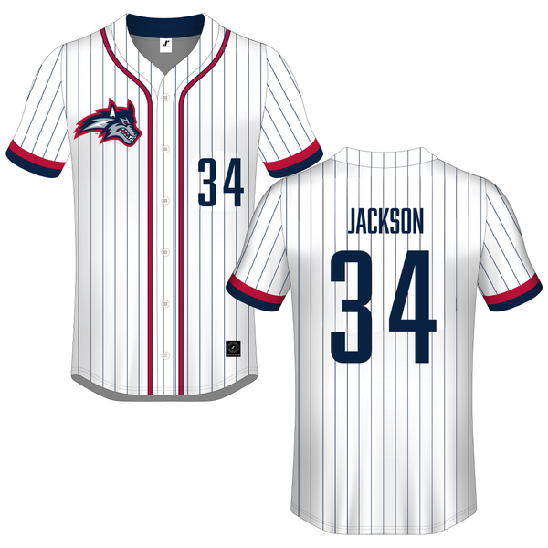 Stony Brook University White Pinstripe Button-Down Jersey - #34 Matt Jackson