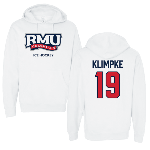 Robert Morris University Ice Hockey (M) White Colonials Hoodie - #19 Tanner Klimpke